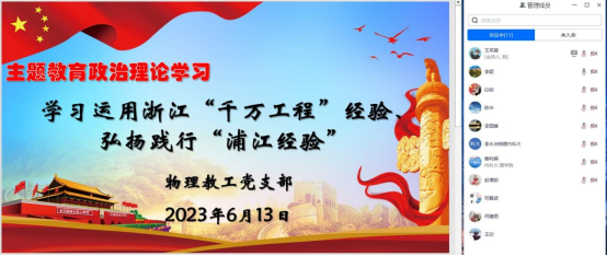 根据公司党委工作部署,物理教工党支部采用线上形式于2023年6月14日开展了关于学习运用浙江“千万工程”经验、弘扬践行“浦江经验”的主题教育,会议由支部书记邓磊波同志主持。