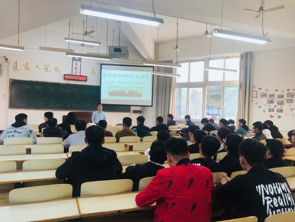 为更好的做好公司毕业生就业工作,让同学们认清就业形势,积极动员同学们就业,公司于2019年10月20日下午四点半,在二教C113教室召开2020届毕业生就业动员大会。本次会议由理公司党总支副书记罗宁老师主持,理公司党总支书记杨晓玲老师、2015级数学班班主任王帅老师,2015级物理班班主任章明老师、304永利集团专职辅导员江凡璐老师以及两个专业部分同学参加。