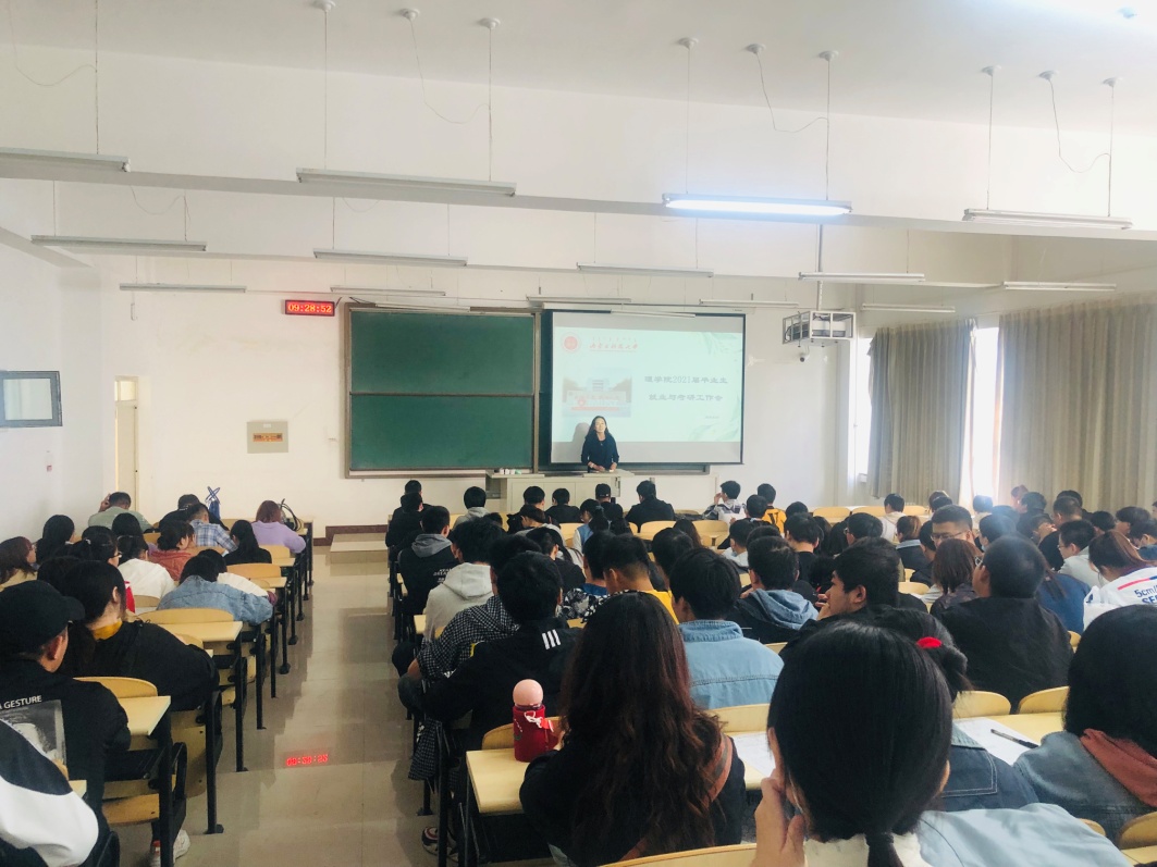 会议伊始,杨晓玲老师介绍了学院2020届毕业生总体就业情况,分析了疫情下就业新形势,建议毕业生要树立先就业再择业正确就业观,抓住“秋招”高峰期的就业机会,鼓励毕业生合理规划时间,考研就业同步进行。并帮助同学们分析了2021届就业形势,她分别从高校毕业生就业人数增加、宏观经济形势影响、疫情影响、物理及数学相关行业对毕业生需求变化、招聘政策方面详细地分析了相对严峻的就业形势。
