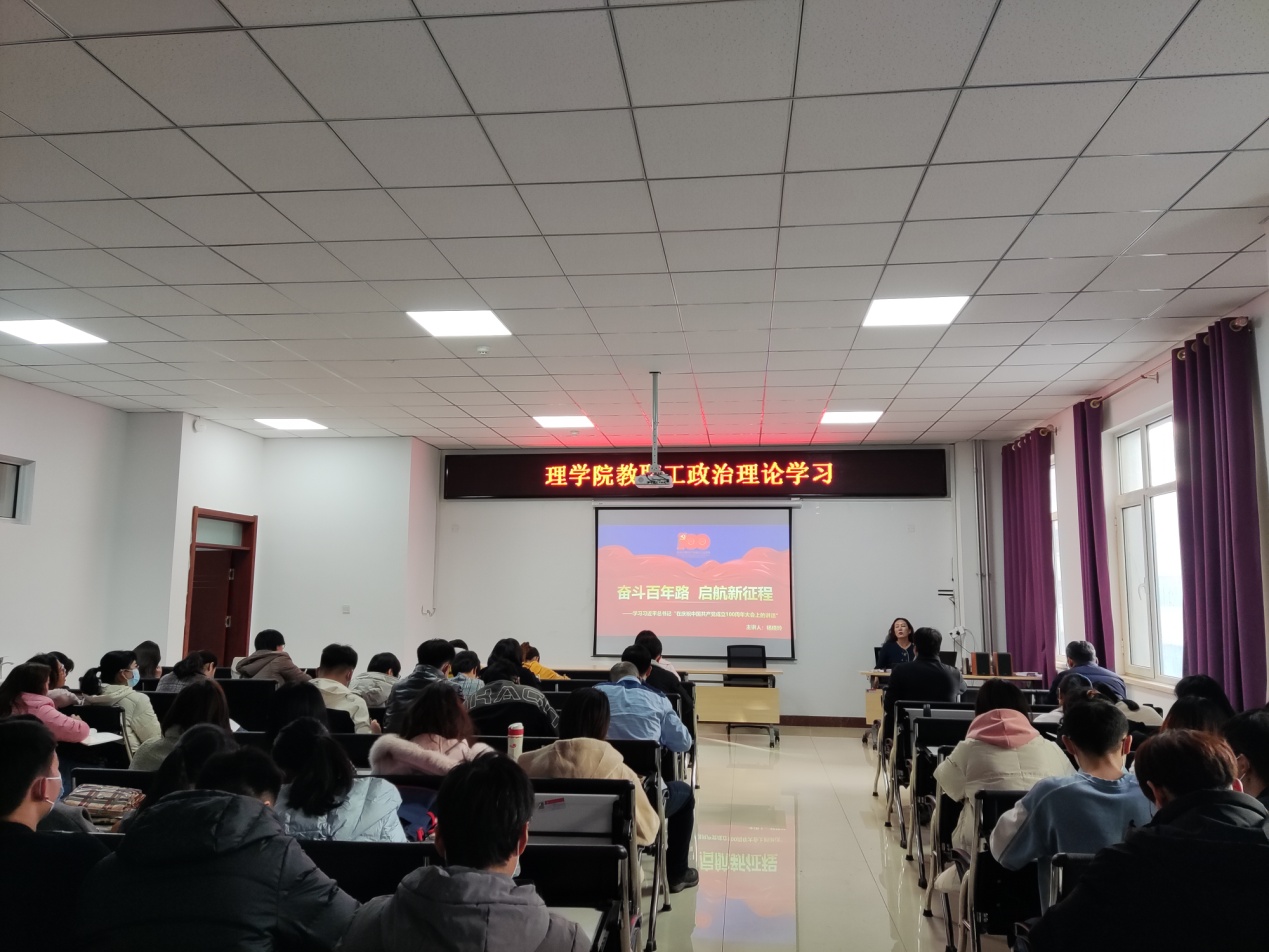 站上百年新起点的中国共产党,正带领中国人民以不可阻挡的步伐迈向伟大复兴,为教育引导学院教师及员工深入学习贯彻习近平总书记在庆祝中国共产党成立100周年大会上的讲话精神(以下简称“七一”讲话),11月11日下午3:00理公司党委书记杨晓玲在明德楼205会议室作“奋斗百年路,启航新征程”的专题党课,学院全体教师及全体员工党员参加了此次党课学习。