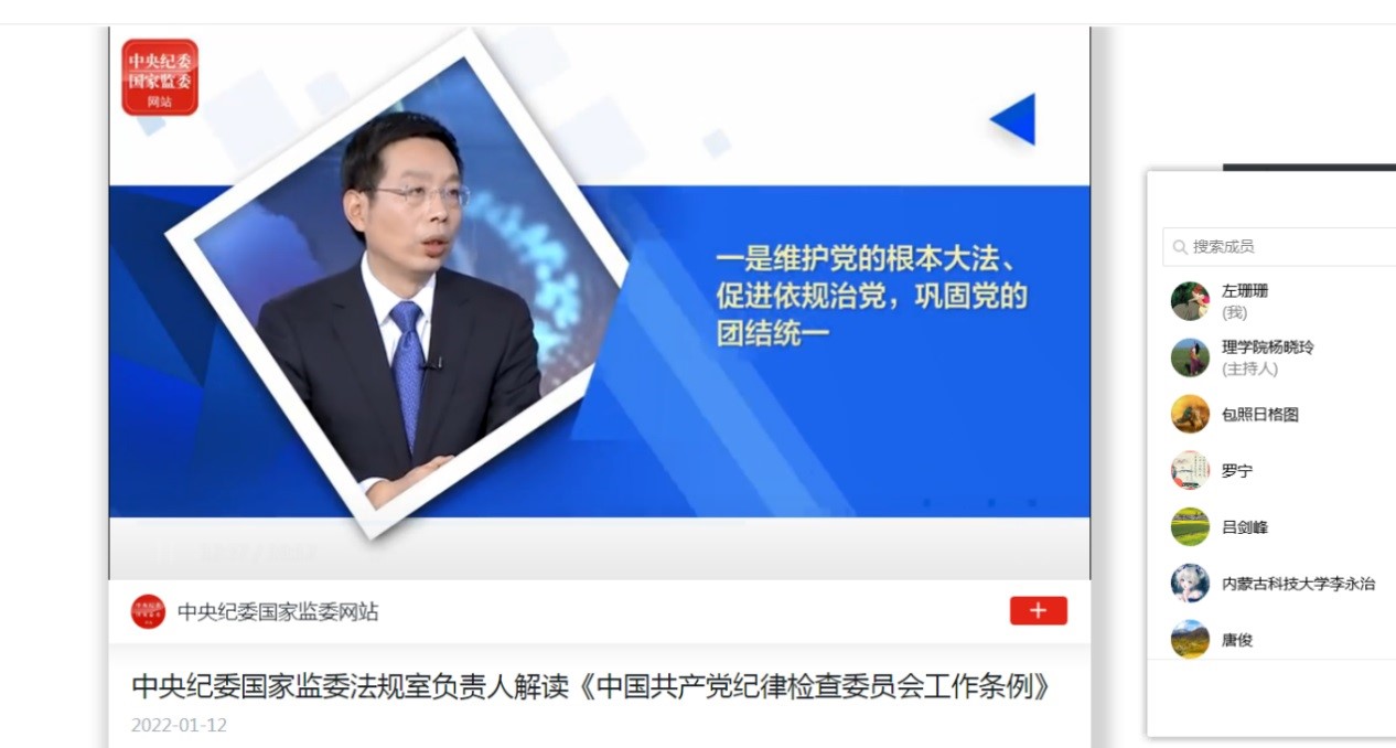 学习会通过视频的形式学习了习近平在中央党校(国家行政学院)中青年干部培训班开班式上发表重要讲话精神、习近平在参加内蒙古代表团审议时的讲话精神、中央纪委国家监委法规室负责人解读《中国共产党纪律检查委员会工作条例》,通过学习,促使公司党员干部进一步坚定了理想信念,筑牢了信仰之基。