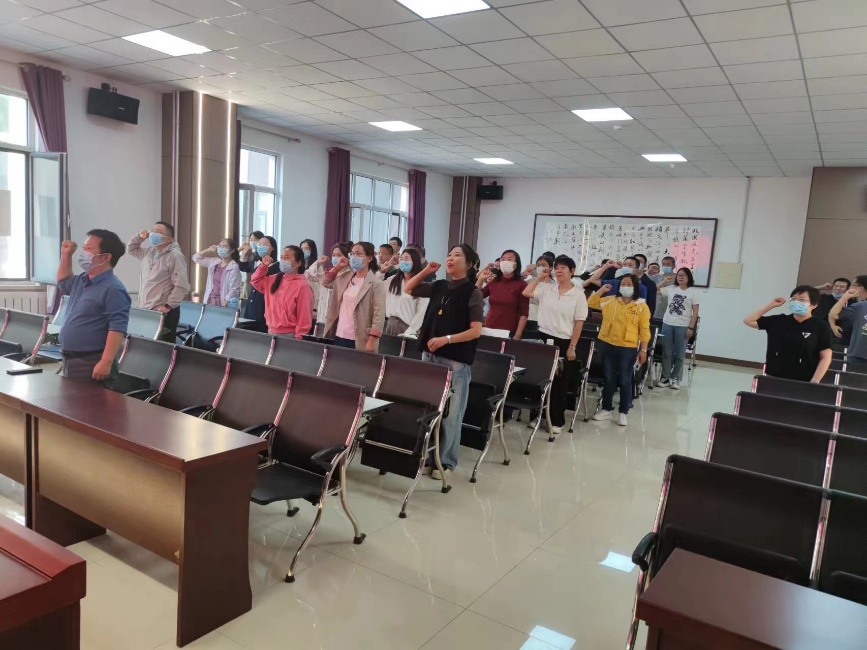在学院的庆祝大会分会场,各位老师兴致勃勃、热情洋溢地全程观看了大会,与主会场一同起立唱国歌,听取优秀教师和员工慷慨激昂的发言,观看各项优秀奖项的授予。在会议的最后,全体教师起立,跟随主会场的老师一起庄严宣誓。