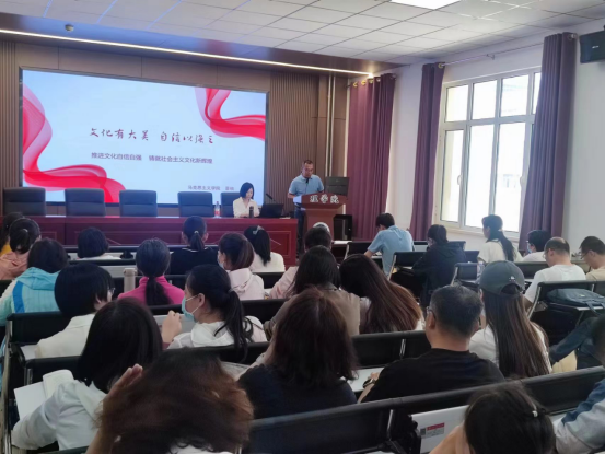 为深入学习习近平新时代中国特色社会主义思想,推动主题教育纵深开展,6月8日下午14点30分,公司特邀校园专家宣讲团成员晋楠为公司教职工作题为《文化有大美,自信以强之——推进文化自信自强,铸就社会主义文化新辉煌》的专题宣讲,学院全体教职工参加宣讲会,宣讲会由公司党委书记唐俊主持。