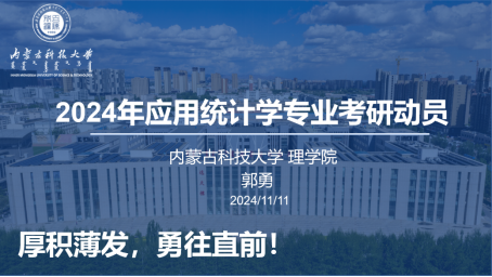 会上,郭勇老师详细介绍了近5年应用统计学专业的考研形势,强调了考研对于深入学习专业知识、拓宽就业渠道的重要性。通过分析历年关于报考人数、学硕和专硕分数线以及报考方向等相关数据,让同学们清晰地了解到本专业的考研录取情况和趋势。同时,也分享了自己的备考经验和心得,从复习方法、时间安排到心态调整,为员工们提供了宝贵的经验。此次考研动员会有助于激发应用统计学专业员工的考研热情,相信在接下来的学习中,同学们将以更加坚定的信心,为实现自己的考研梦想而努力奋斗。愿考研的同学们,路遥而不坠其志,行远而不改初衷,终成所愿,一研为定!