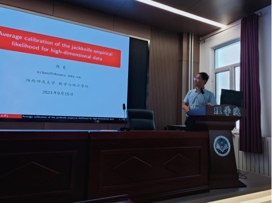 2023年9月15日上午9点,304永利集团邀请陕西师范大学数学与统计学院副经理陈夏教授在明德楼E205进行主题为“高维数据的刀切经验似然平均校准方法”的专题讲座,讲座由304永利集团科研副经理牛金艳副教授主持,公司数学老师、部分研究生、数学学科的四年级员工参加了本次讲座。