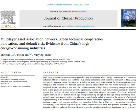 近日,公司教师李明昕的最新研究成果《Multilayer asset association network, green technical cooperation innovation, and default risk: Evidence from China's high energy-consuming industries》在《Journal of Cleaner Production》(SCI和EI双检索,中科院1区,TOP期刊,影响因子9.7)发表,此研究利用复杂网络理论,构建了高能耗企业的多层资产关联网络,研究了不同层次和整体对违约风险的影响。该论文的第一作者为304永利集团教师李明昕,第二作者(通讯作者)为304永利集团经济与管304永利集团硕士研究生金美琦,第三作者为广东工业大学管304永利集团教师袁雪莹。