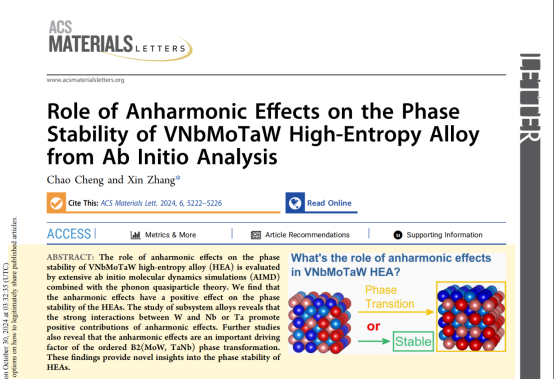近日,《ACS Materials Letters》(中科院1区,影响因子9.6)刊发了公司程超老师的学术论文“Role of Anharmonic Effects on the Phase Stability of VNbMoTaW High-Entropy Alloy from Ab Initio Analysis”,程超老师为该论文第一作者。该研究课题得到了内蒙古自然科学基金青年基金项目、内蒙古自治区直属高校基本科研业务费项目和内蒙古自治区引入高层次人才项目的支持。