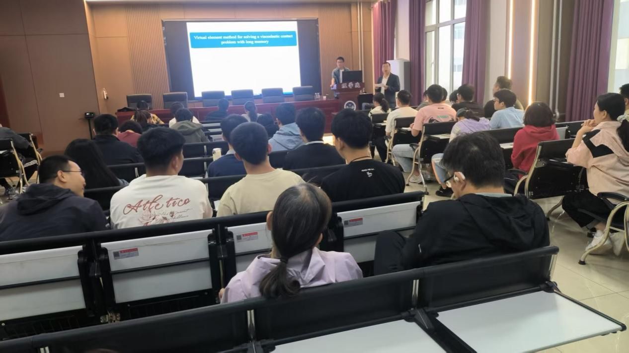 肖文强老师介绍了使用虚元法来求解一个在接触问题中出现的、与历史相关的半变分不等式。详细分析了一种基于梯形法则进行时间积分离散化和基于虚元法进行空间离散化的全离散格式。给出了三个数值算例,为理论上预测的最优收敛阶提供了数值依据。在场师生认真聆听报告,并与肖文强老师进行了热烈的学术交流与探讨,此次学术讲座为公司的师生提供了一次高水平高质量的学术交流。