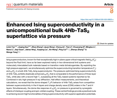 近日,公司硕士生导师闫立敏老师以第一作者在量子材料领域权威期刊《npj Quantum Materials》(中科院1区Top,影响因子5.4)发表题为“Enhanced Ising superconductivity in a unicompositional bulk 4Hb-TaS2 superlattice via pressure”的学术论文。