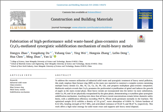 近日,《Construction and Building Materials》(中科院1区TOP期刊,JCR分区:Q1,影响因子8.0)刊发了公司硕士研究生学术论文“Fabrication of high-performance solid waste-based glass-ceramics and Cr2O3-mediated synergistic solidification mechanism of multi-heavy metals”。公司2023级物理学专业硕士研究生赵东宇为该论文第一作者,物理学硕士生导师杜永胜教授为通讯作者。该研究小组依托公司“白云鄂博矿多金属资源综合利用”平台开展相关研究。
